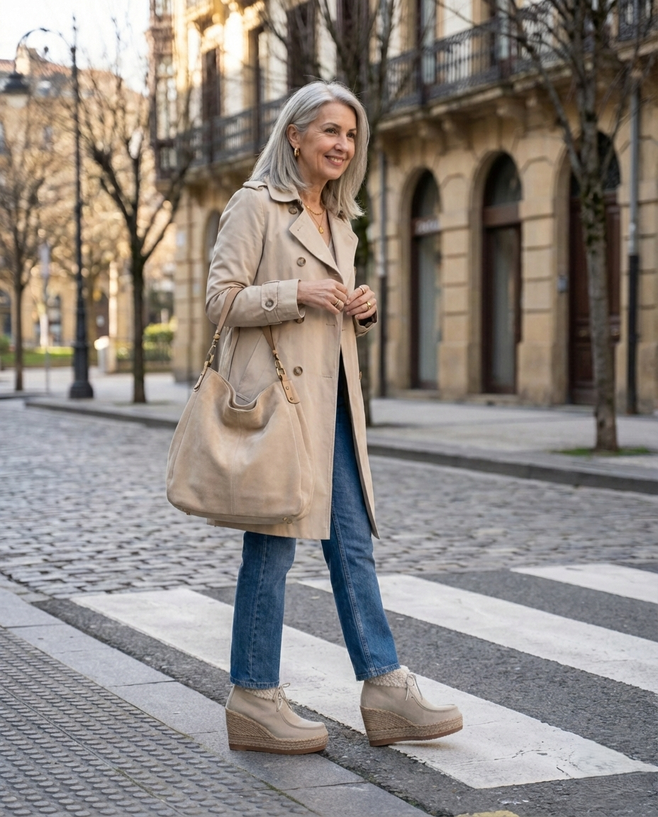 La clave en marzo no está en sustituir, sino en ajustar. Mantener bases neutras como beige, gris, blanco roto o arena permite que el conjunto conserve armonía. Aligerar los tejidos – sustituir la lana gruesa por punto fino o estructuras más suaves – aporta frescura sin perder abrigo. Y, sobre todo, cambiar el calzado antes que el resto del look transforma el mensaje completo sin necesidad de excesos.