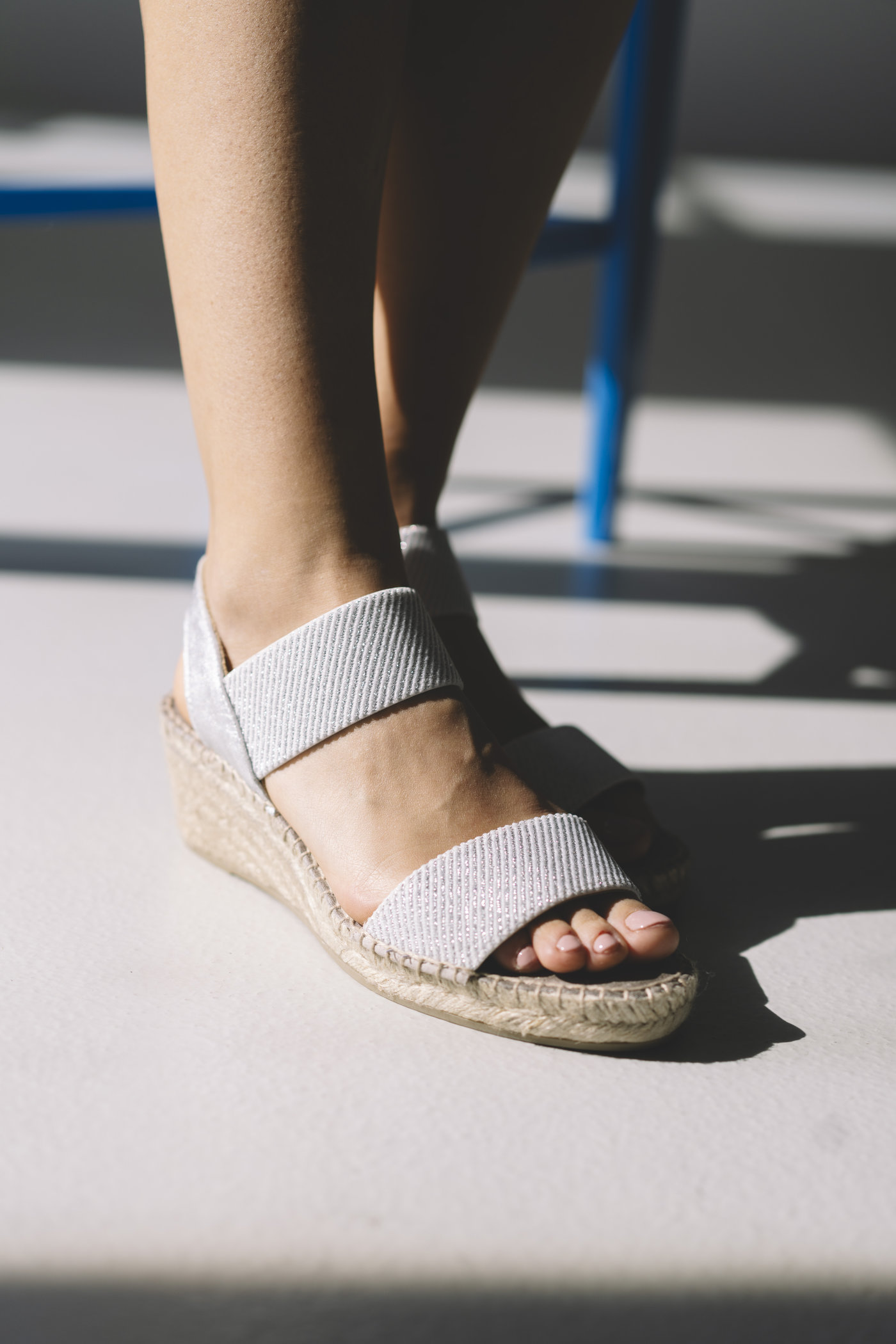 La cuña de yute natural tiene 6 cm de altura, pensada para estilizar la silueta manteniendo estabilidad y ligereza. Esta sandalia plateada con cuña de yute eleva lo justo, favorece la pierna y permite caminar con seguridad durante horas.