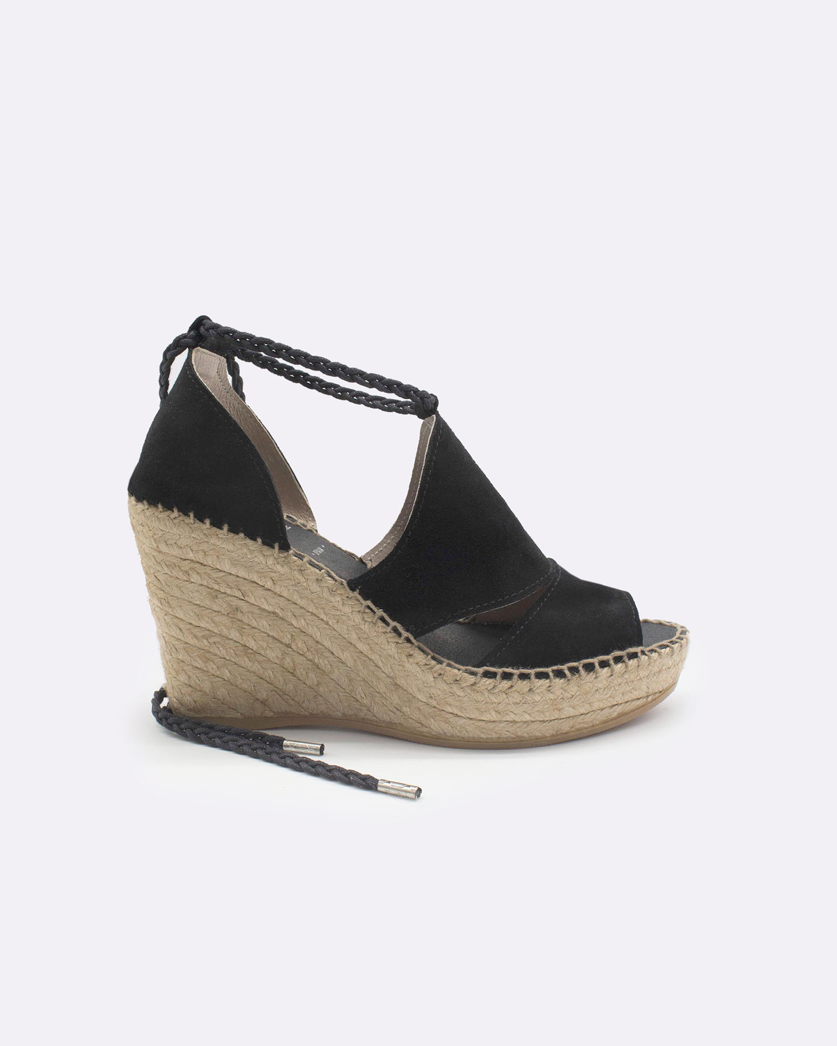 El modelo SILVITA NEGRO es una alpargata negra con cuña de 10 cm. La parte delantera tiene una altura de 4 cm, lo que hace que sea un calzado muy cómodo. Una sandalia que estiliza gracias a su altura y al cordón trenzado del mismo tono que se ata a tu pierna.